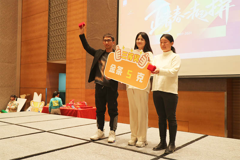 隨著三等獎(jiǎng)的抽出,晚會(huì)氣氛達(dá)到一個(gè)小高潮。幸運(yùn)兒們滿(mǎn)心歡喜地領(lǐng)取了獎(jiǎng)品5克金條。